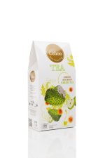 Ceylon Large Leaf Green Tea (91,5%) with natural soursop juice (3%), safflower flowers (2,5%), soursop pieces (2%), apple pieces (1%).